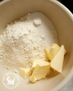Start by measuring out the flour, butter and sugar in a bowl and rub them together using your fingers and thumbs to form crumbs.