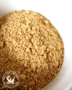- Put the biscuit crumbs in a bowl and add the melted butter. Stir until all the biscuits are coated in the butter.