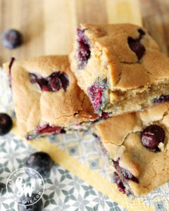 This is so easy to make and it is a mix between cake and cookie. It definitely has a cookie feel but the lightness of a bake. A beautiful combination. The blueberries look great studded in the mix before and after cooking.