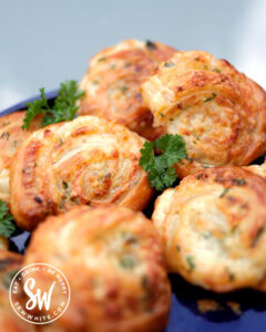 Make in advance and freeze the slices before baking. Then bake from frozen when ready. My favourite way to make this in advance is to prepare the butter filling and mix in the cheese too. Then I store it in the fridge for up to 2 days. Then easily remove it, spread it on the puff pastry and it’s ready to go. Red Leicester, Mozzarella and strong cheeses can work so well with this recipe.