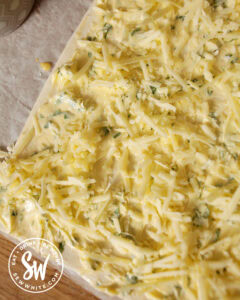 Now it’s time to add your gated cheese! The more the merrier, in my opinion, you can either mix multiple kinds of cheese together or just use one strong flavour.