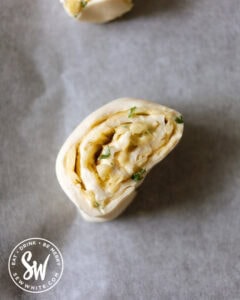 - Slice the roll into slices of approximately 1" pinwheels (I do them about a thumbs width). Place them on the baking tray leaving a gap between them.