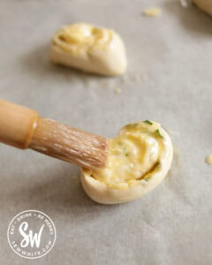 Lay your cheesy garlic pinwheels onto baking paper on your baking tin and wash them with a little egg or milk to help them brown.