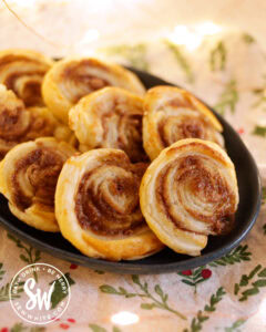 These cinnamon puff pastry swirls are so easy to whip up you can make them the same day you plan on eating them. But if you would like to bake a large batch for your festive party then make the swirls into a roll and place in the fridge over night.