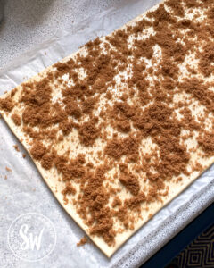 - In a bowl mix together the cinnamon and the light brown soft sugar. Sprinkle it over the pastry evenly.