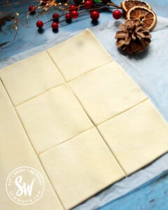 Roll out your pastry and cut it into even squares.