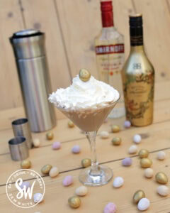 Make this an Easter egg cocktail by serving this Easter cocktail in the chocolate egg. Take a hollow egg and gently break off the top of the egg. Have a quick look to make sure there are no holes in the bottom of the egg before pouring the cocktail in. Top up with whipping cream and decorate with mini eggs and