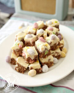 This recipe for the mini egg fridge cake is also a great way to use any extra chocolate you might have after Easter. It tastes lovely with mini eggs but I love adding different types. Some hollow chocolate ones, caramel ones etc. It’s wonderful!