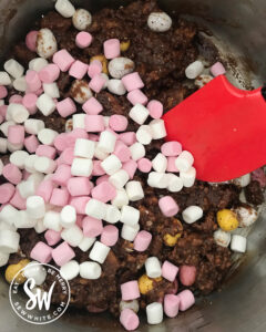 Mix your crushed biscuits, marshmallows and mini eggs into the melted chocolate. It will thicken and harden quickly so make sure you stir everything through thoroughly.
