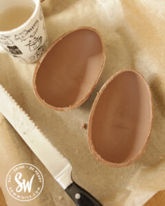 Start by cutting your Easter Egg in half using the warm knife trick. Scroll down to the FAQs for an in depth guide.