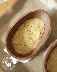 - Divide the crumbs equally between the Easter eggshells and gently push the biscuit mix so they compact into the bottom. Place them in the fridge for the crumb layer to set. There might be a little leftover depending on the egg size.