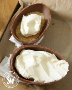 Divide the crumbs equally between the Easter egg shells and gently push the biscuit mix so they compact into the bottom. Place them in the fridge for the crumb layer to set.