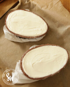 To half your Easter Egg without cracking them you should warm up a thin, sharp knife in a bowl of hot water then, gently slide it around the egg seam to soften the chocolate. Adding a little pressure each time, the Chocolate egg should split open beautifully! Don’t worry if it cracks, you can make the Easter egg cheesecake in a tin and decorate it with the broken pieces!