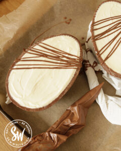 - Divide up a chocolate easter egg in half. Place them on a baking tray or plate which can fit in the fridge. Secure them with kitchen paper underneath to stop them from rocking.