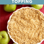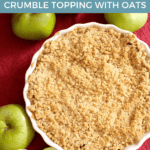 I love this healthy oat crumble topping. It works with all types of fruit and is the perfect make-ahead dessert. My crumble topping with oats can be frozen and sprinkled over your apples, plums, or any fruit at all just before baking. In my opinion, there is nothing better than an easy apple crumble with oats topping drizzled in custard or with a scoop of ice cream.