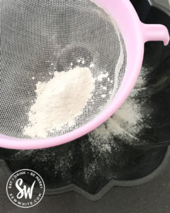 When I have done the two layers I sieve the flour into the tin and tap the excess away. This also gives the tin an extra layer to help the cake come out smoothly. This dusting however also is important as it shows anywhere you might have left.