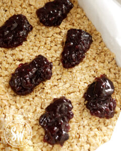 - Add half of the flapjack mixture to the prepared tin and add the jam to make a jammy layer.