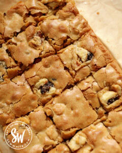 - Allow the blondie to cool in the cake tin until easy to handle and remove from the tin, place on a cooling rack and slice into bitesize pieces or bars.
