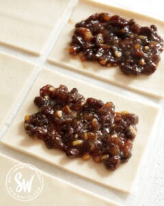 Spoon the mincemeat onto the middle of half your pastry squares. Making sure not to overfill otherwise it will burst out the sides.
