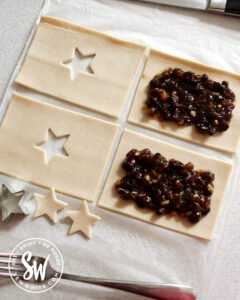 - Using Christmas cutters or carefully using a knife cut out shapes onto the pieces without the mincemeat. These will be the top of the hand pies.