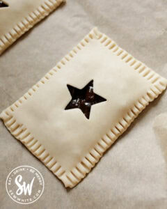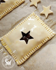 Cut different Christmas shapes into the lids of your mince pie pop tarts. I’ve used a star cutter in this recipe but I’ve made hearts, little reindeer or mini gingerbread men too.