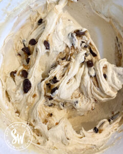 You can make this mincemeat sponge cake by hand or with the mixer. If you use a mixer stop before adding the mincemeat in and mix it in my hand so it stays in bigger lumps through the mixture.