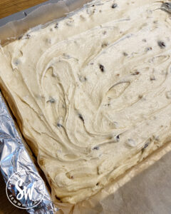 - Pour the mix into the prepared sheet pan/traybake tin and level out. Gently tap the tin on the worktop to remove any air bubbles.