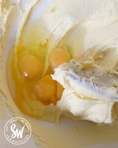 - Add the eggs and mix in, one at a time. Add in the vanilla extract.