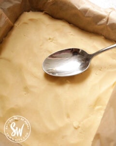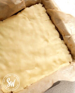 Press the shortbread into your lined baking tin, using the back of a spoon will often help you get an even base.