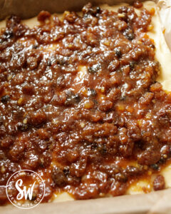 Then, bake your mincemeat traybake slices for 30 – 35 minutes, until it’s golden brown.