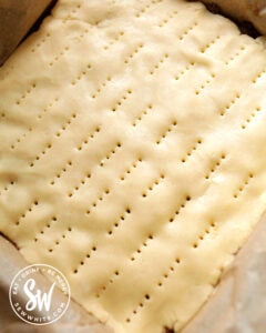 - Use a fork to make holes all over the mincemeat shortbread and it's ready for the oven.
