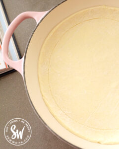 I’m obsessed with my pink Le Creuset shallow casserole. I use it for everything!