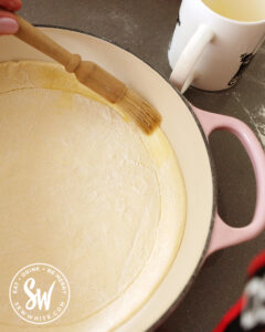 Cut the pastry into a circle and place it at the bottom of the dish. Mark a 1.5-2cm border using a knife. Using a pastry brush, brush the melted butter on and around the border.