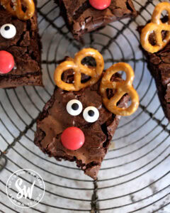 If you’re having a big Christmas party, you can make these reindeer brownies bites to serve, cut them into little squares and they make brilliant brownie bites.