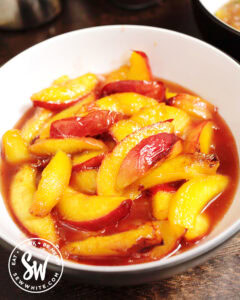 - First make the compote, add the fresh peaches and sugar to a non-stick pan and cook until caramelised. Set aside.