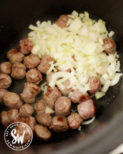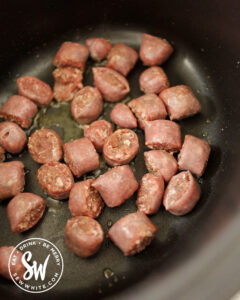 - Add the sausages to the hot oil and keep moving the sausage chunks around the pan until brown on all sides – around 5 minutes. They do not need to be cooked through.