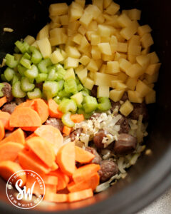 - Add the crushed garlic, chopped celery, sliced carrots and cubed potatoes to the slow cooker.