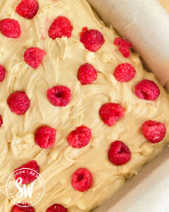 Stud the blondie mixture with the fresh raspberries and lightly press in. Bake for 30 minutes and until the top feels set to the touch and is light brown colour.