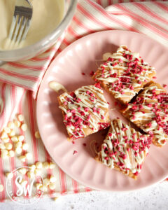 Decorate the raspberry white chocolate blondies however you wish with more raspberries, melted white chocolate or a combo of both! I also like to add sprinkles.