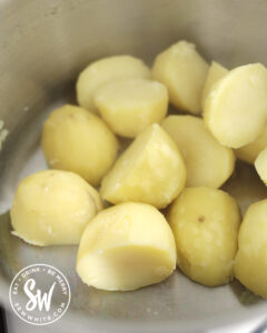 The best part of making roast potatoes is being able to parboil them ahead of time. Boiling potatoes until they’re about three quarters cooked makes them quicker to roast in the oven. Which is great as we try and save electricity. It also means you can put them in the oven 30 minutes or so before you need them.