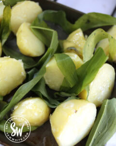 Preheat the oven to 180ºC fan, 30 minutes before you are ready to serve them. Put a metal baking tray on the hob (make sure it’s hob safe) with rapeseed oil. Add the potatoes and about 10 leaves of wild garlic. Using a spoon, move the potatoes about so they get covered.