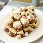 These Easter Chocolate Fridge Tray Bake bitesize pieces are always a fabulous addition to an Easter party or event. This mini egg chocolate fridge cake is quick to make and will be set in the fridge in about an hour. Filled with Mini Eggs, Easter chocolate and topped with even more chocolate this is one recipe for those with a sweet tooth. It's also a great way to use up your leftover Easter chocolate.