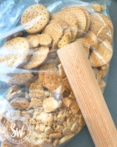 Crush the digestives into crumbs and add them to the melted chocolate mixture. (I use a rolling pin and hit the biscuits while they are in a bag to make the crumbs. A food processor works too).