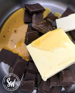 Melt the butter, golden syrup and chocolate in a saucepan on a gentle heat, keep stirring. Take it off the heat when it’s all melted together.