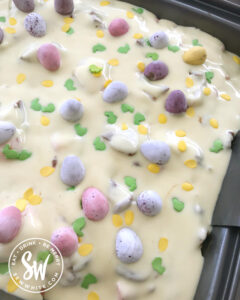 Decorate with mini eggs or other eggs/decorations you like, plus of course a lot of sprinkles.