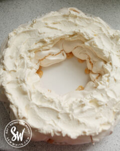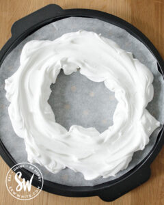 Pull a dessert or serving spoon around the circle to make a shallow trench and link all the blobs of meringue together. (This will be for the cream and toppings to sit in).