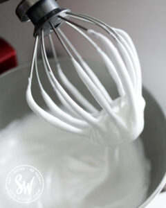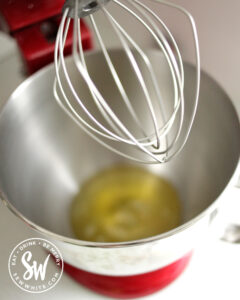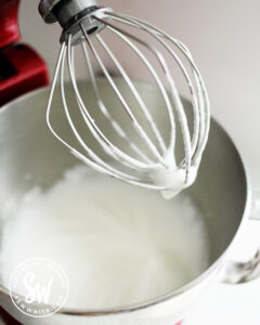 Gradually add the caster sugar a little at a time. Make sure the whisk is on a medium to high speed until the mix starts to go stiff and glossy.