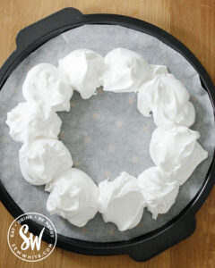 Spoon the egg white meringue onto the circle drawn on the greaseproof paper in blobs.