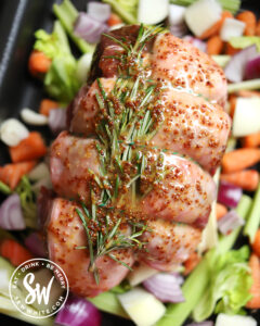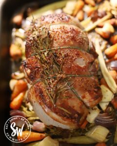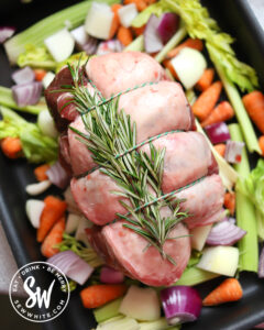 When preparing the roasting pan for the lamb I like to lay a mix of carrots, onion and celery on the bottom to make a bed for the meat. This also helps make a lamb gravy later as you can use the roasting tin, the vegetables and the fats/juices from the lamb that are leftover.