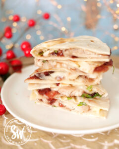 These delicious leftover turkey quesadillas are made with leftover turkey, leftover cranberry sauce, and all the cheese you love. The best part of this recipe is that they take only minutes to make! You can use up all your leftovers and answer the question of what to do with leftover turkey.